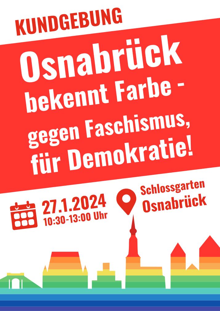 Die Evangelische Kirche im Sprengel Osnabrück, der Evangelisch-lutherische Kirchenkreis Osnabrück und die Diakonie Osnabrück Stadt und Land rufen ihre Mitarbeitenden und Gemeindeglieder dazu auf, sich an der Kundgebung und den weiteren Demonstrationen am 27. Januar um 10.30 Uhr im Schlossgarten in Osnabrück zu beteiligen.