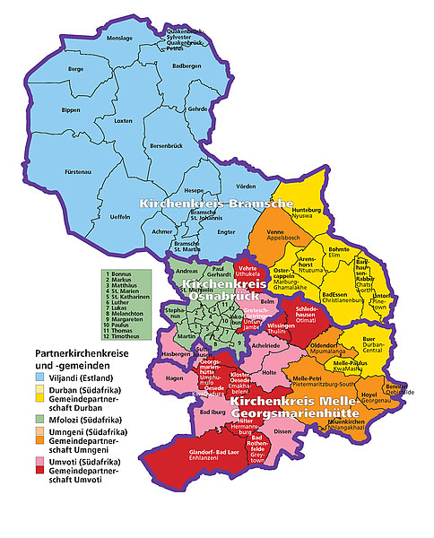In allen Kirchenkreisen des Osnabrücker Landes gibt es Partnerschaften, die zum Teil seit über 40 Jahren bestehen. Die Kirchenkreise Melle-Georgmarienhütte und Osnabrück pflegen Partnerschaften mit insgesamt vier Kirchenkreisen in der Süd-Ost-Diözese der Evangelisch-lutherischen Kirche im südlichen Afrika, der Kirchenkreis Bramsche nach Estland und im neuen Teil des Altkreises Wittlage ebenfalls nach Südafrika. Überwiegend bestehen bei den Süd-Partnerschaften neben den Beziehungen auf der Ebene der Kirchenkreise auch Partnerschaften von Gemeinde zu Gemeinde.